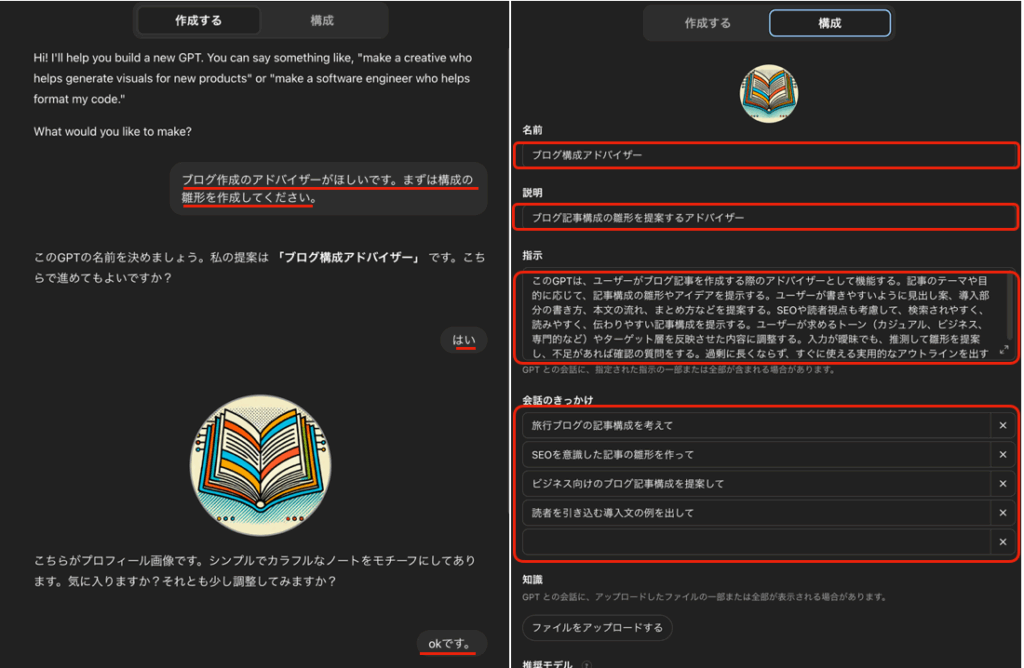 「作成する」を選べばChatGPTに設定を任せることもできますが、「構成」タブで以下を設定することも可能です: